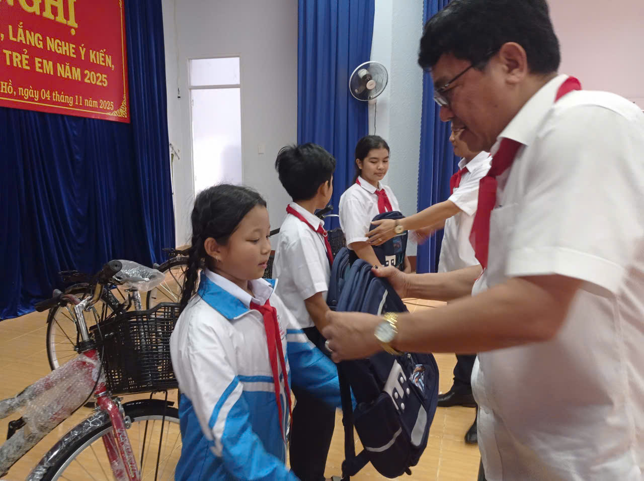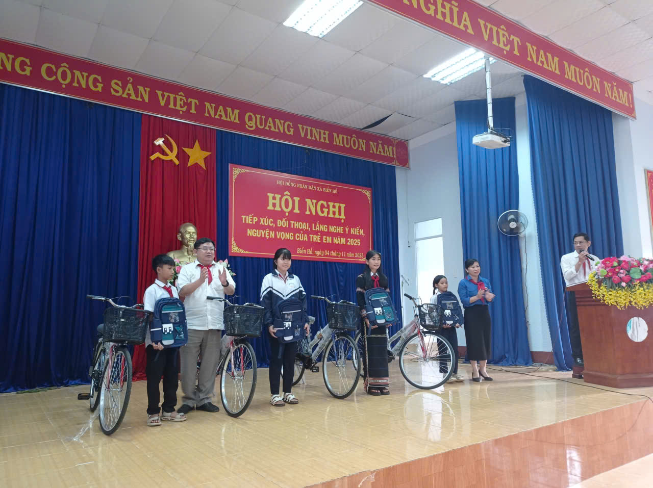 Nhân dịp này, Ban Tổ chức trao tặng 9 xe đạp và nhiều phần quà trị giá 18 triệu đồng cho học sinh có hoàn cảnh khó khăn, biết vươn lên trong học tập. Buổi đối thoại diễn ra trong không khí cởi mở, thân tình, góp phần nâng cao nhận thức của cấp ủy, chính quyền và cộng đồng trong việc chăm lo, bảo vệ và phát huy tiếng nói của trẻ em.