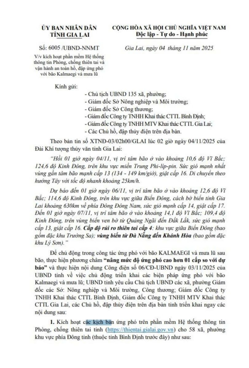 Thứ năm, 06/11/2025 | 11:05 A- A A+ | UBND tỉnh Gia Lai Kích hoạt phần mềm Hệ thống thông tin Phòng, chống thiên tai và vận hành an toàn hồ, đập ứng phó với bão Kalmaegi và mưa lũ Chia sẻ Đọc bài Lưu UBND tỉnh Gia Lai vừa có văn bản 6005/UBND-NNMT ngày 4/11/2025 V/v Kích hoạt phần mềm Hệ thống thông tin Phòng, chống thiên tai và vận hành an toàn hồ, đập ứng phó với bão Kalmaegi và mưa lũ
